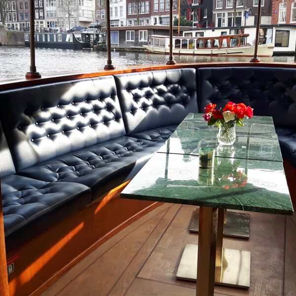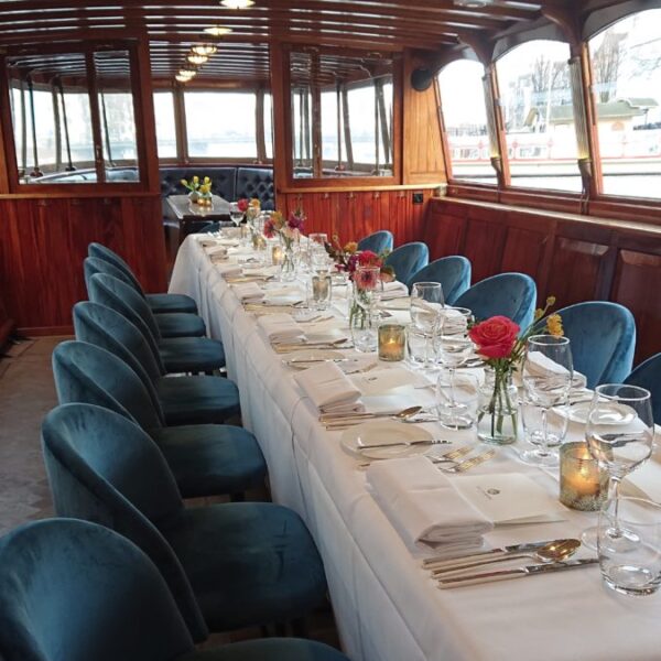 Sinds 1995 siert de ‘Monne de Miranda’ de Amsterdamse grachten als een indrukwekkende verschijning. Deze luxueuze salonboot biedt plaats aan 10 tot 50 gasten voor een lunch en/of diner aan boord. Wat deze boot echt bijzonder maakt, zijn de extra grote ramen die een adembenemend uitzicht garanderen terwijl je geniet van je maaltijd. Net als onze salonboot Elisabeth wordt de ‘Monne de Miranda’ elektrisch aangedreven, waardoor het varen fluisterstil is.