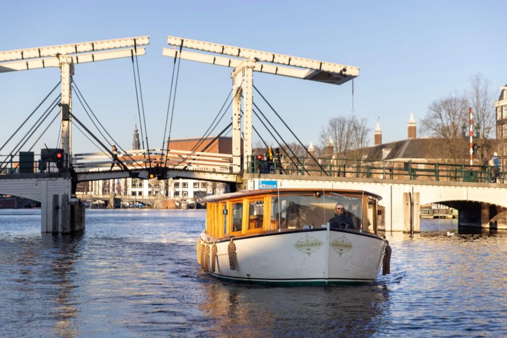 Vanaf het water krijg je een panoramisch uitzicht over de Amstel en zie je de brug in al haar glorie. Overdag is het een charmant gezicht, maar ’s avonds, wanneer duizenden lichtjes de contouren verlichten, is het werkelijk adembenemend.